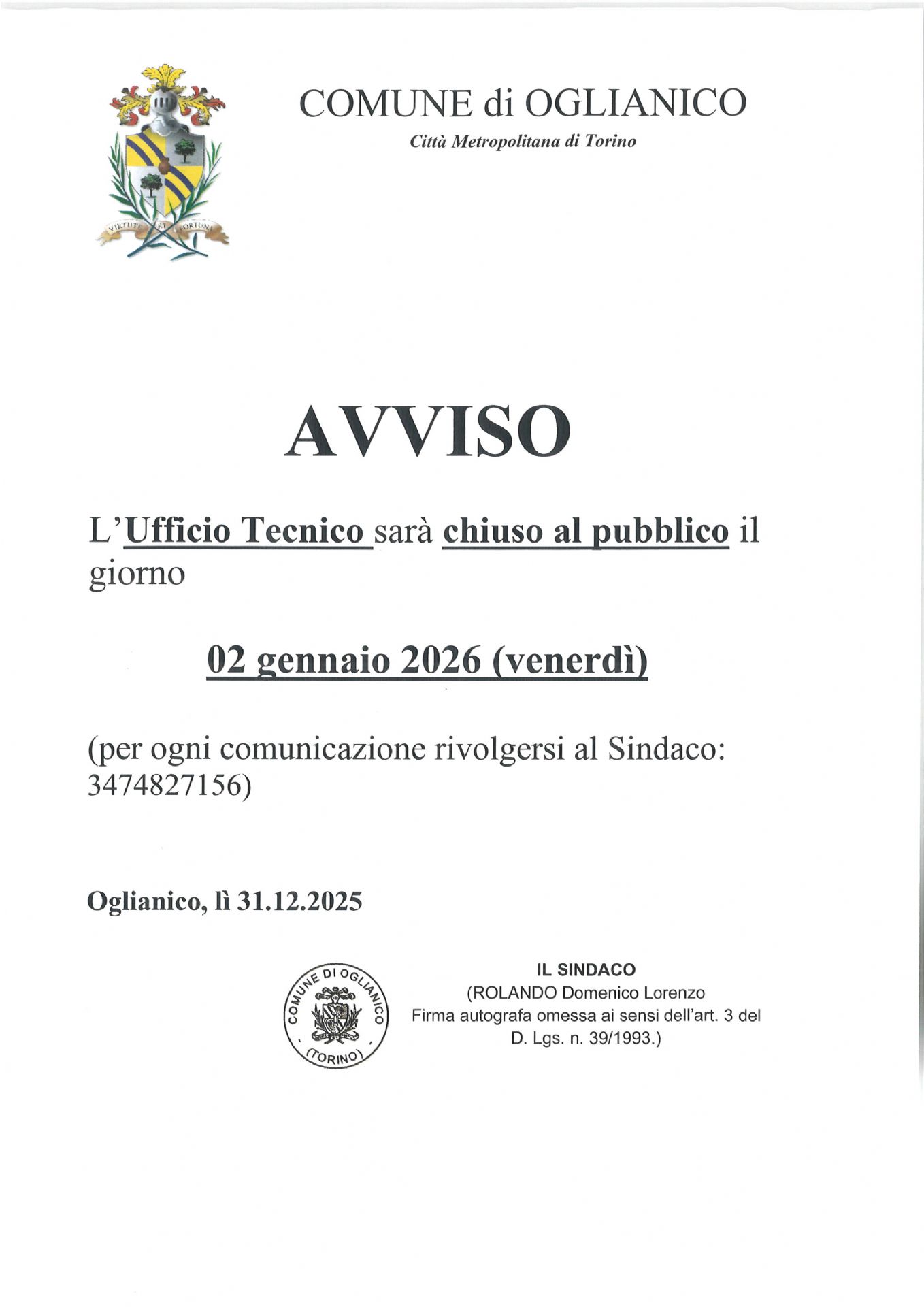 L’Ufficio Tecnico sarà chiuso al pubblico il giorno