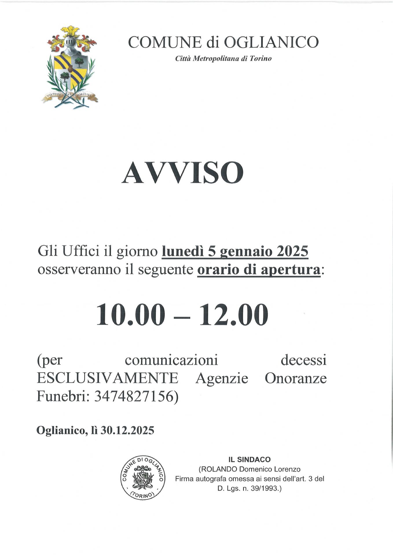 Gli Uffici Comunali il giorno 5 gennaio 2026 (lunedì) osserveranno il seguente orario di apertura:
