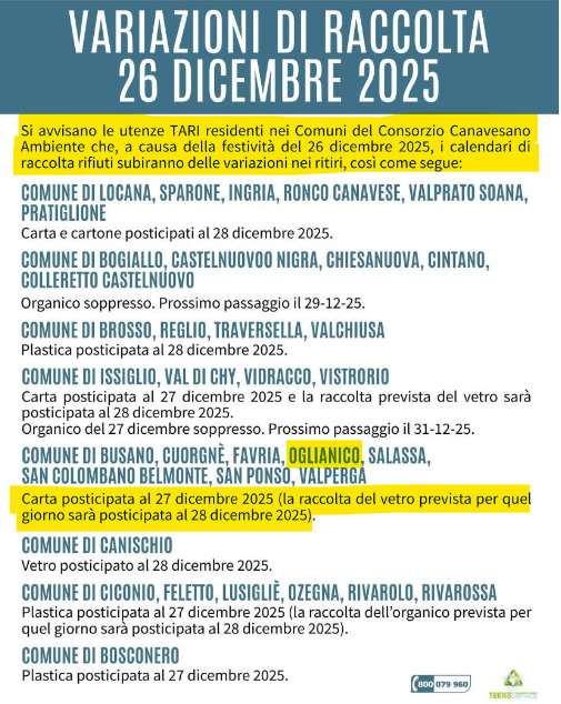 Si avvisano le utenze TARI che a causa della festività del 26 dicembre 2025, i calendari di raccolta rifiuti subiranno delle variazioni nei ritiri come da locandina.