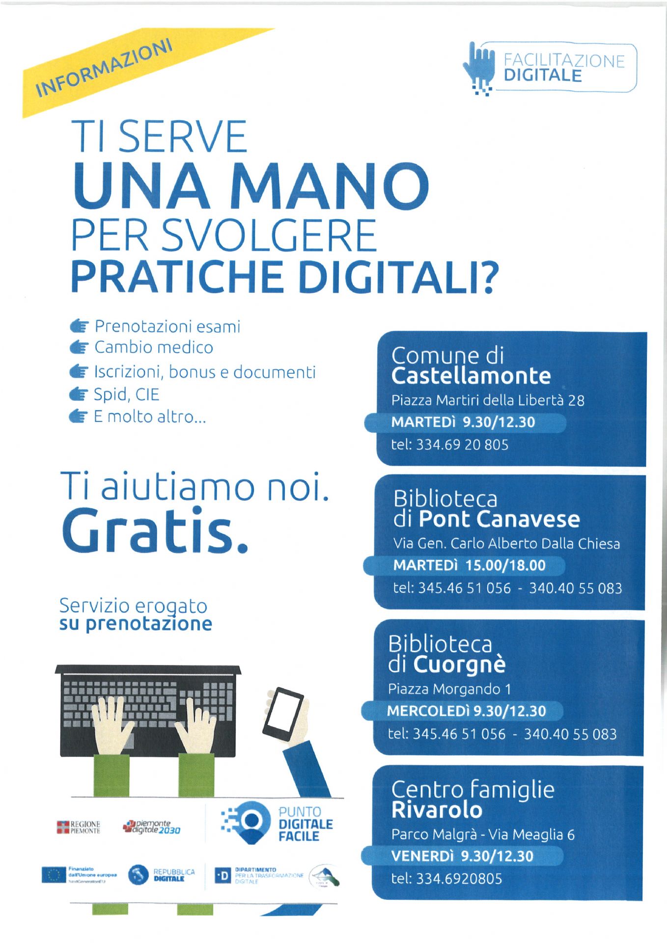 Si comunica che è stato abilitato lo sportello "facilitazione digitale" per dare supporto ai Cittadini per svolgere pratiche digitali: prenotazioni esami, cambio medico, spid,, cie e molto altro altro.