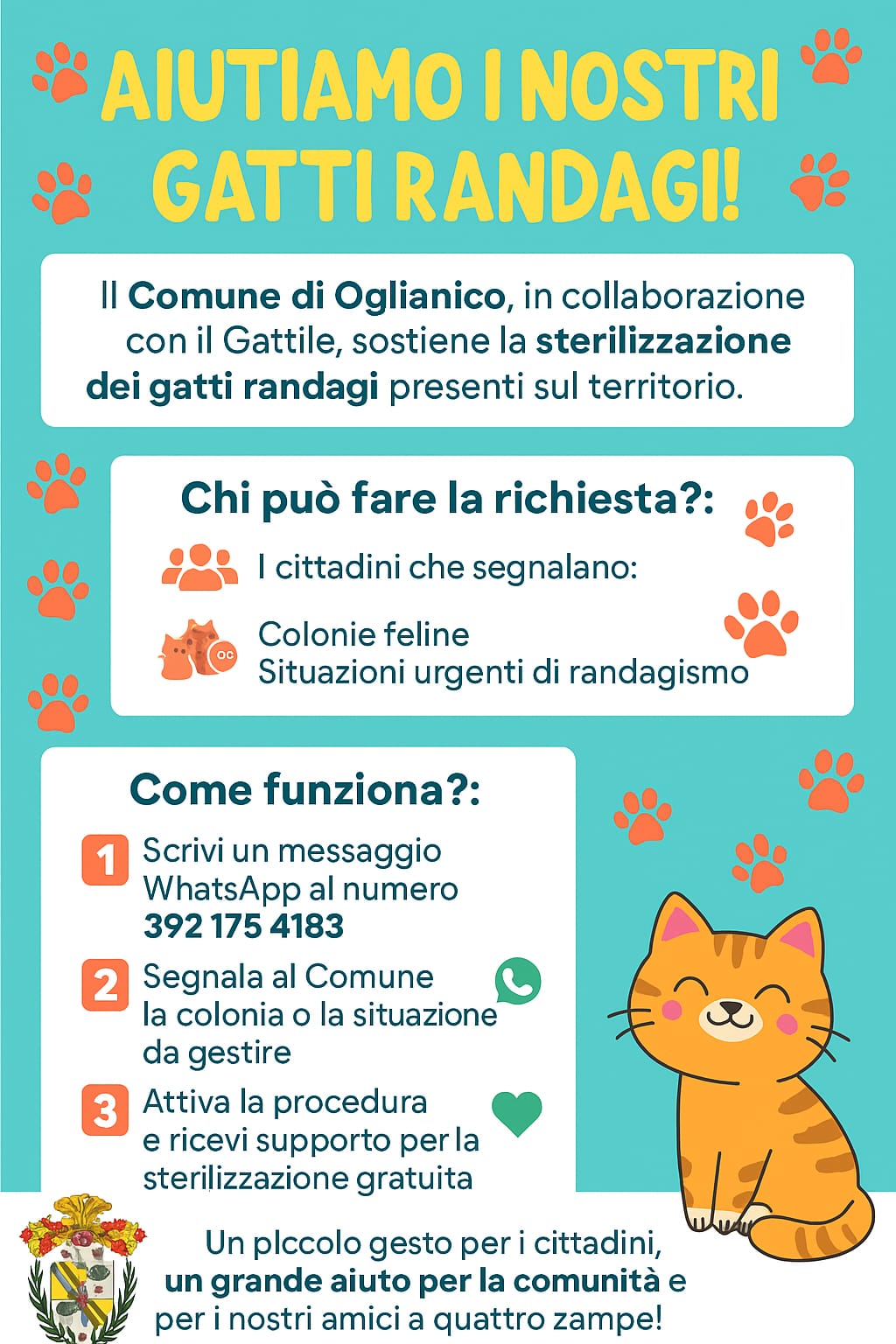 Il Comune di Oglianico, in collaborazione con il Gattile, sostiene la sterilizzazione dei gatti randagi presenti sul territorio.