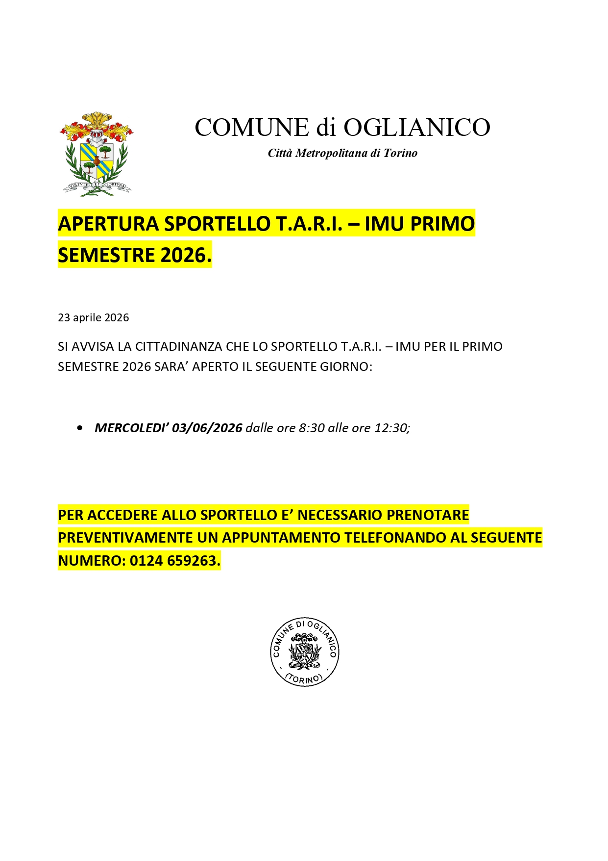 Si avvisa la cittadinanza che lo sportello t.a.r.i. – imu per il primo semestre 2026 sarà aperto il seguente giorno: