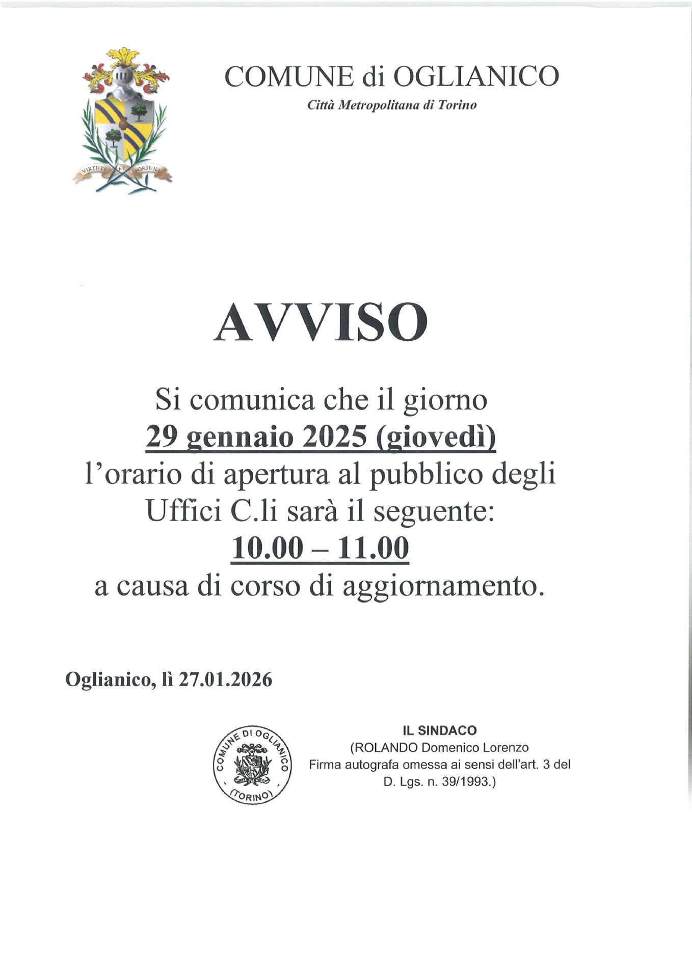 Si comunica che il giorno 29 gennaio 2025 (giovedì) l’orario di apertura al pubblico degli Uffici C.li sarà il seguente: 10.00 – 11.00 - a causa di corso di aggiornamento.